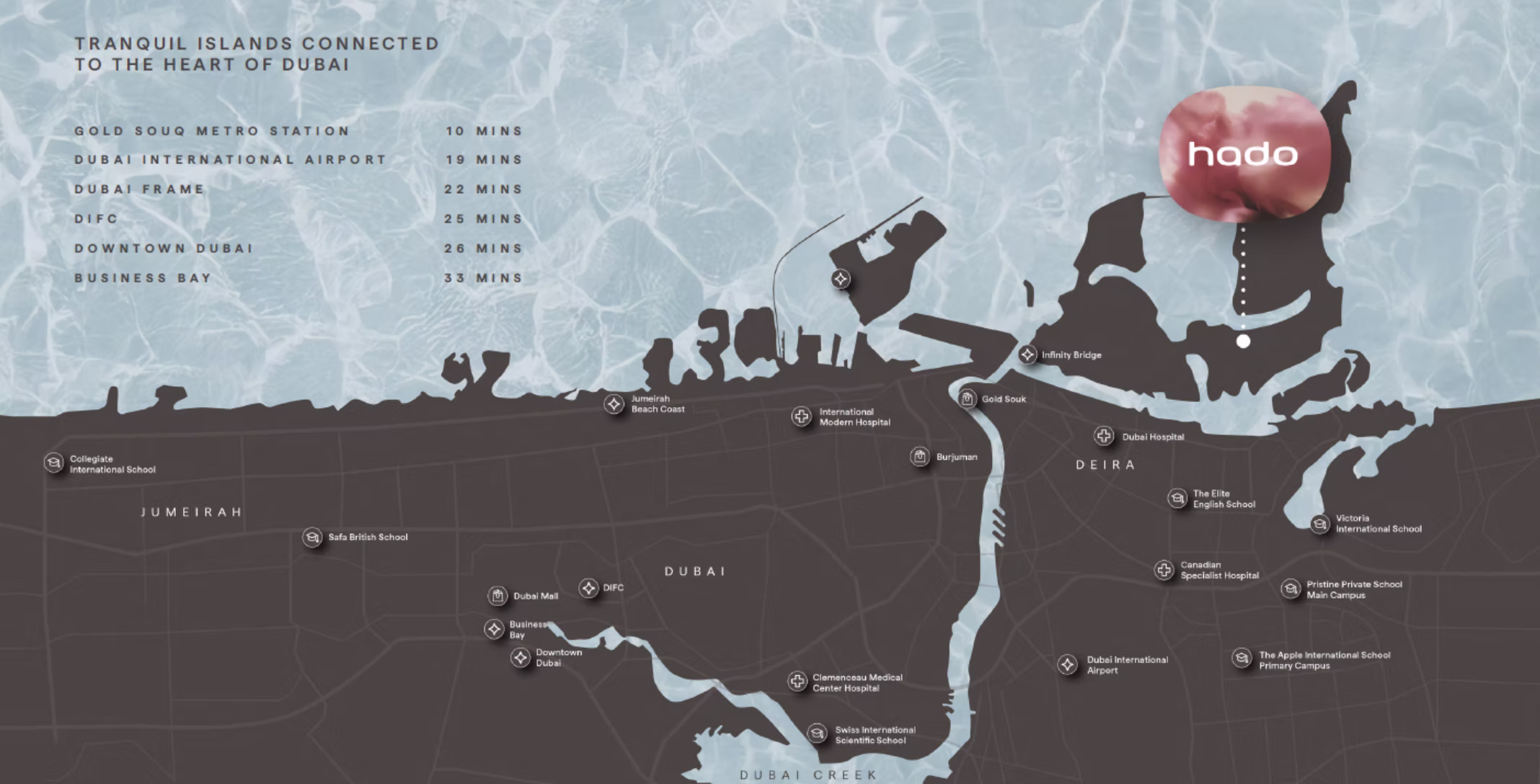 HADO vzniká v samotnom srdci SIØRA na Dubai Islands. Pobrežie s viac ako 20 kilometrami pláží, vrátane časti ocenenej certifikáciou Blue Flag, dopĺňajú promenády, marina a rozsiahle verejné priestory, ktoré vytvárajú prirodzene uvoľnenú atmosféru s plným zázemím pre každodenný život.